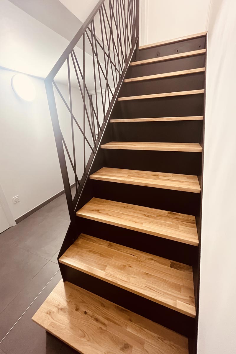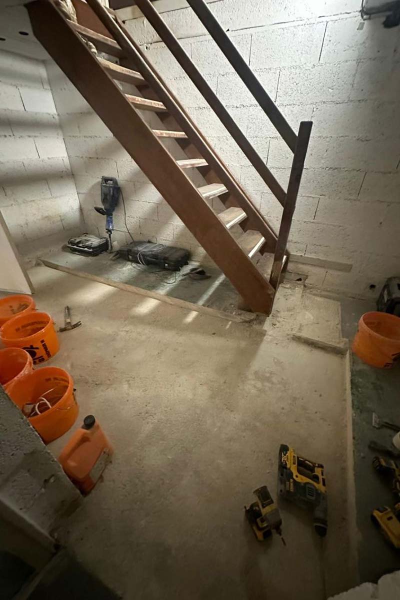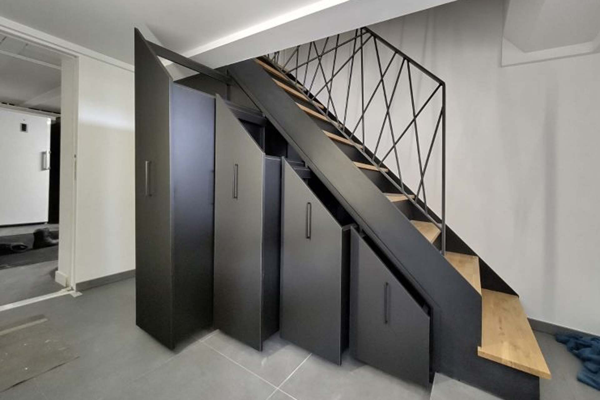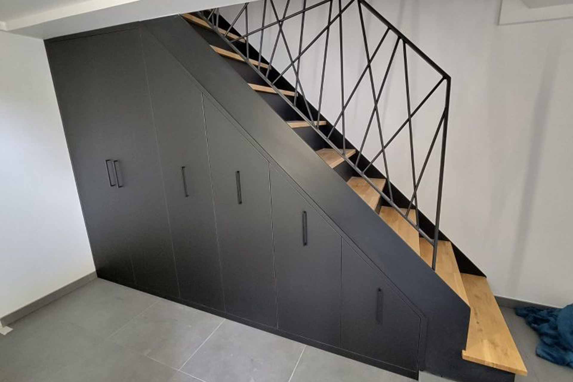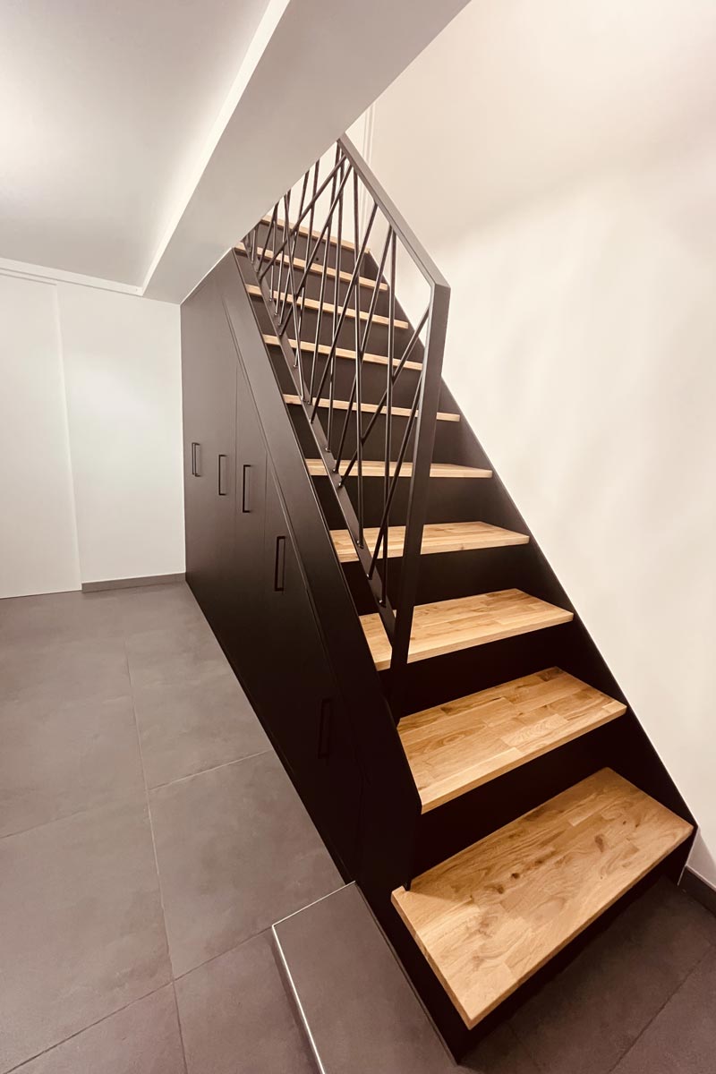 Projet de rénovation d'une entrée avec escalier. Placards sur mesure rangements sous marches. Rénovation totale: dépose de l'existant, agrandissement de la trémie, isolation des murs périphériques, fabrication d'un escalier et de placards sur mesure. Revêtements murs et sol.